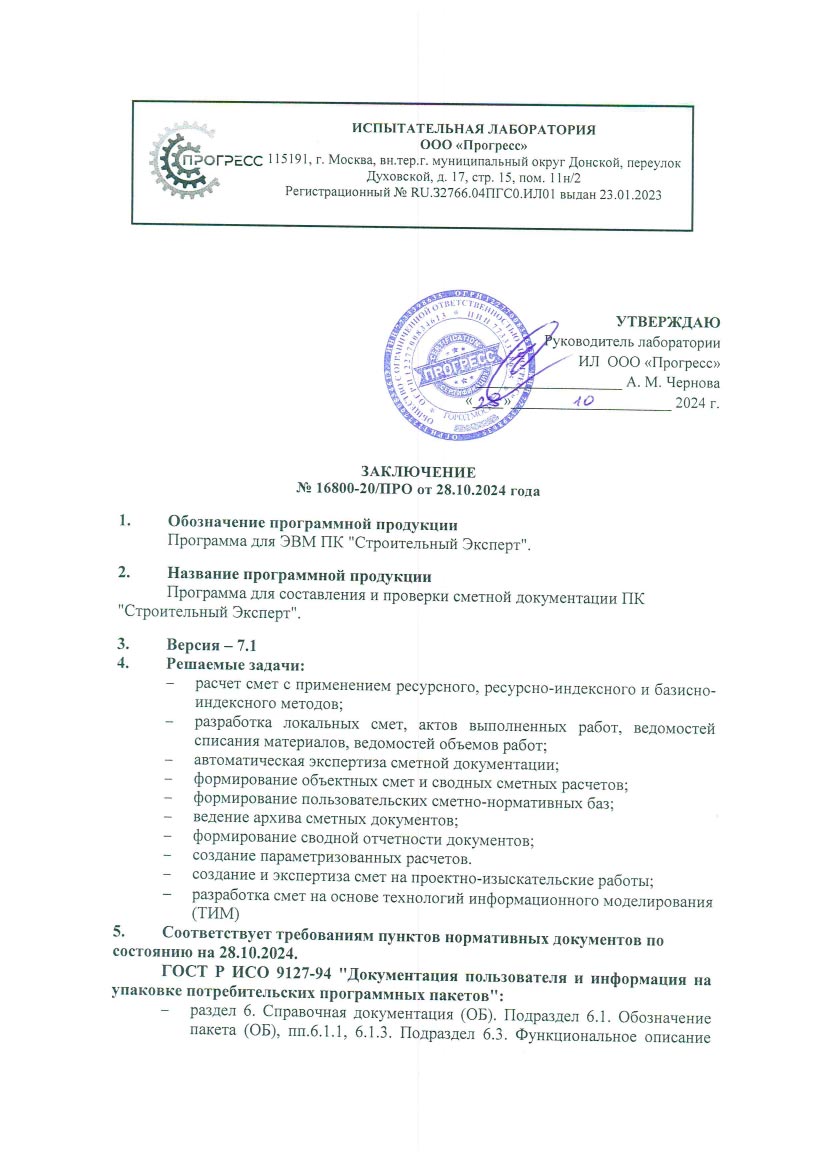 ПК "Строительный Эксперт" ™, прошел сертификацию в ООО "Центрим". Орган по сертификации программной продукции в строительстве на соответствие требованиям нормативных документов ГОСТ 28195-89, разд. 2, п.2.1 (пп.1.1, 1.2, 2.1 - 2.3, 3.1-3.3, 6.1, 6.2); ГОСТ 28806-90, разд. 2, пп.13-16; ГОСТ Р ИСО 9126-93, разд. 4, пп.4.1 - 4.4; ГОСТ Р ИСО 9127-94, разд. 6, пп.6.1.1, 6.3.1, 6.3.3, 6.5.1 - 6.5.3, 6.5.5; ГОСТ Р ИСО/МЭК 12119-2000, разд. 3, пп.3.1.1, 3.1.3, 3.2.1 - 3.2.5